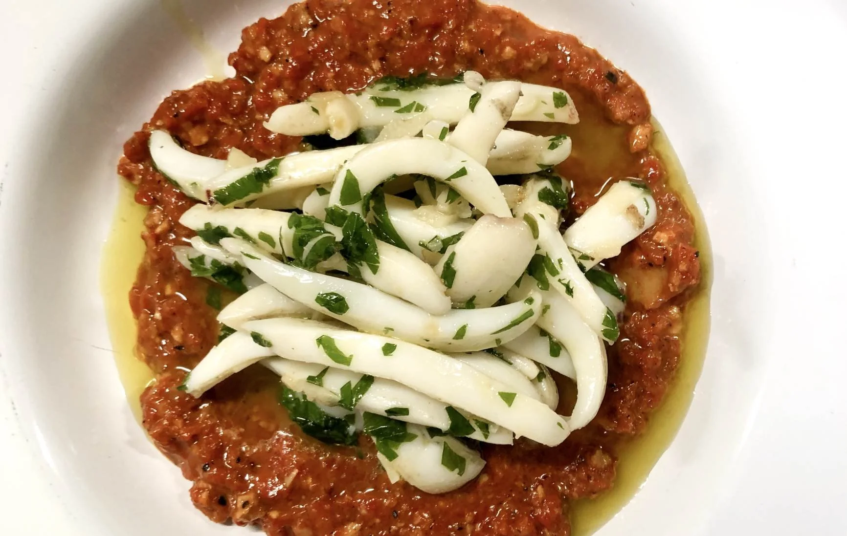 Cut cuttlefish into long strips lengthwise, heat up a cast iron pan, add olive oil, fry garlic for a few seconds, add cuttlefish, season with salt, saute for no more than 30 seconds. Add a splash of apple cider vinegar and turn stove off. Let it cool down a bit and add parsley.